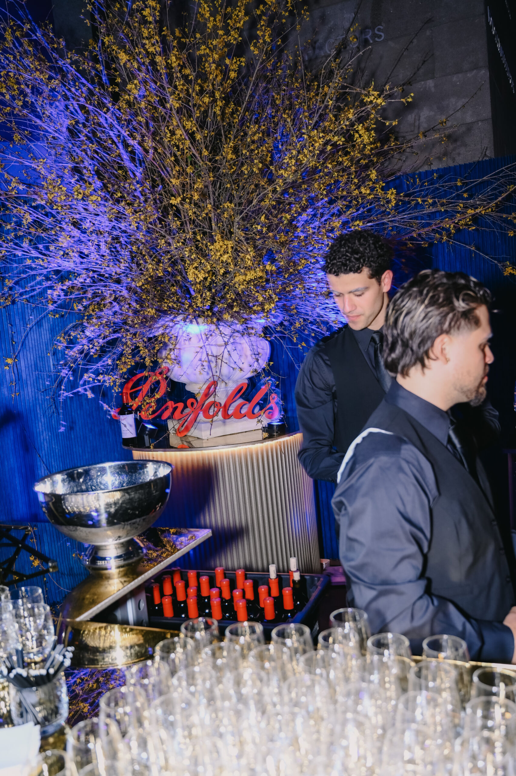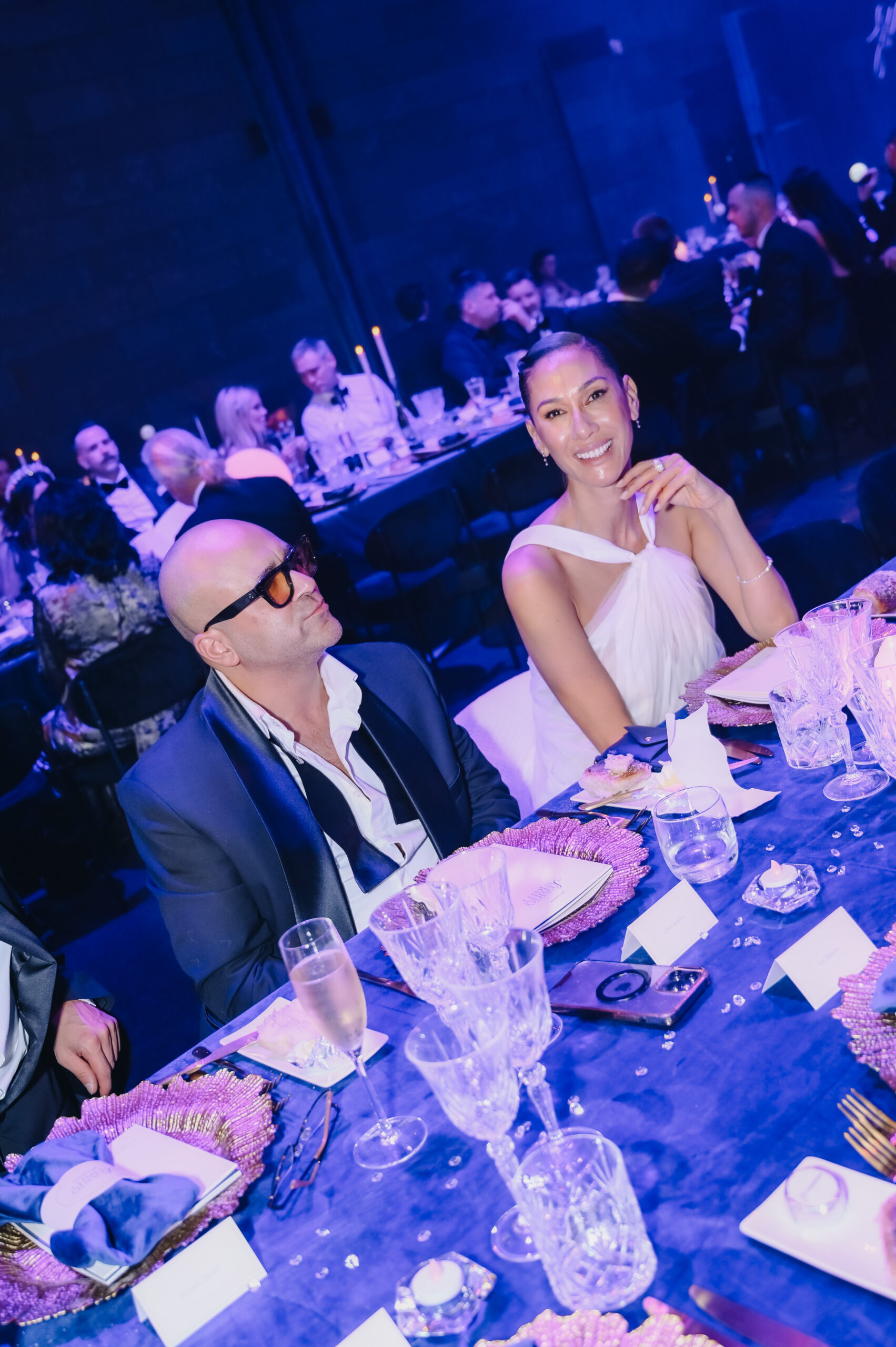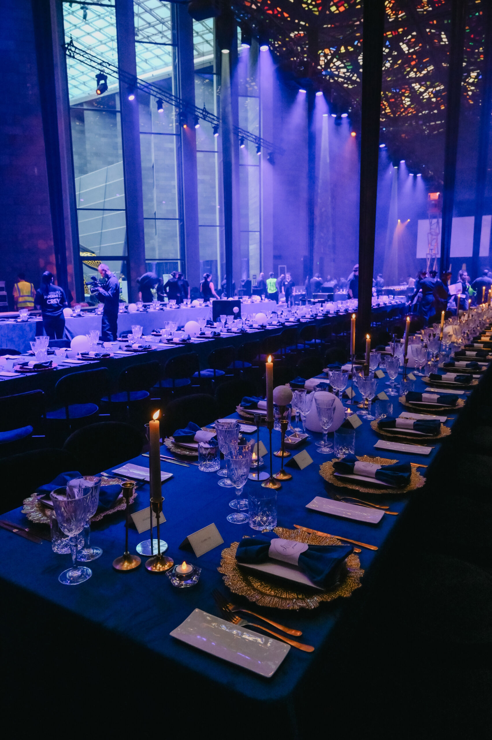 Guests entered through a candlelit forecourt before being transported into a celestial dining hall transformed by deep midnight drapery, mirrored surfaces, and soft constellations cast across the room. Every visual cue — the reflective materials, the flowing silks, the shimmer of glass and gold — mirrored the vastness of the universe, creating a sense of wonder and intimacy within the NGV’s monumental space.